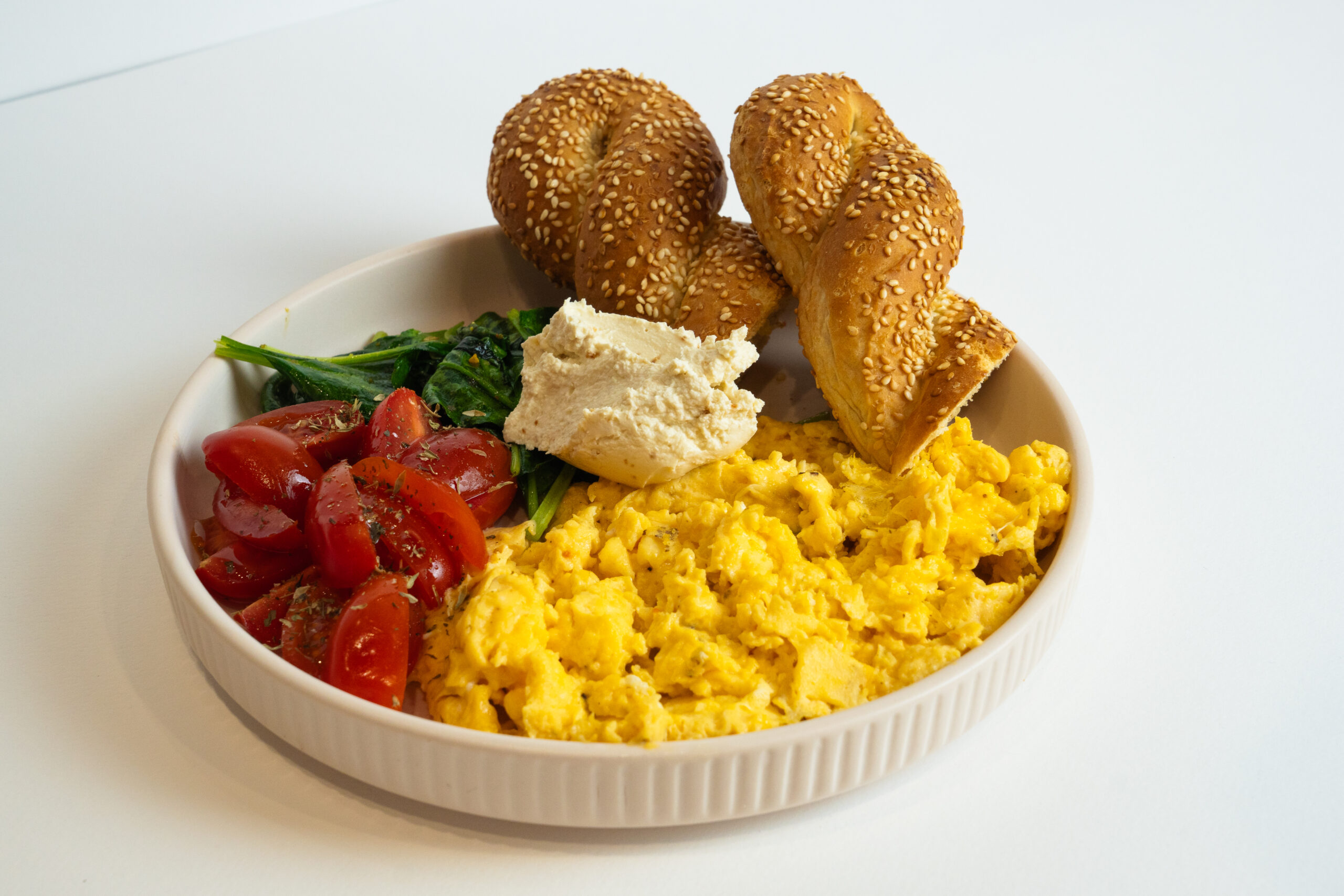 Κουλούρι θες/νίκης , scramble αυγά , σοτέ σπανάκι , ντοματίνια , καπνιστή κρέμα τυρί , μαύρο σουσάμι
