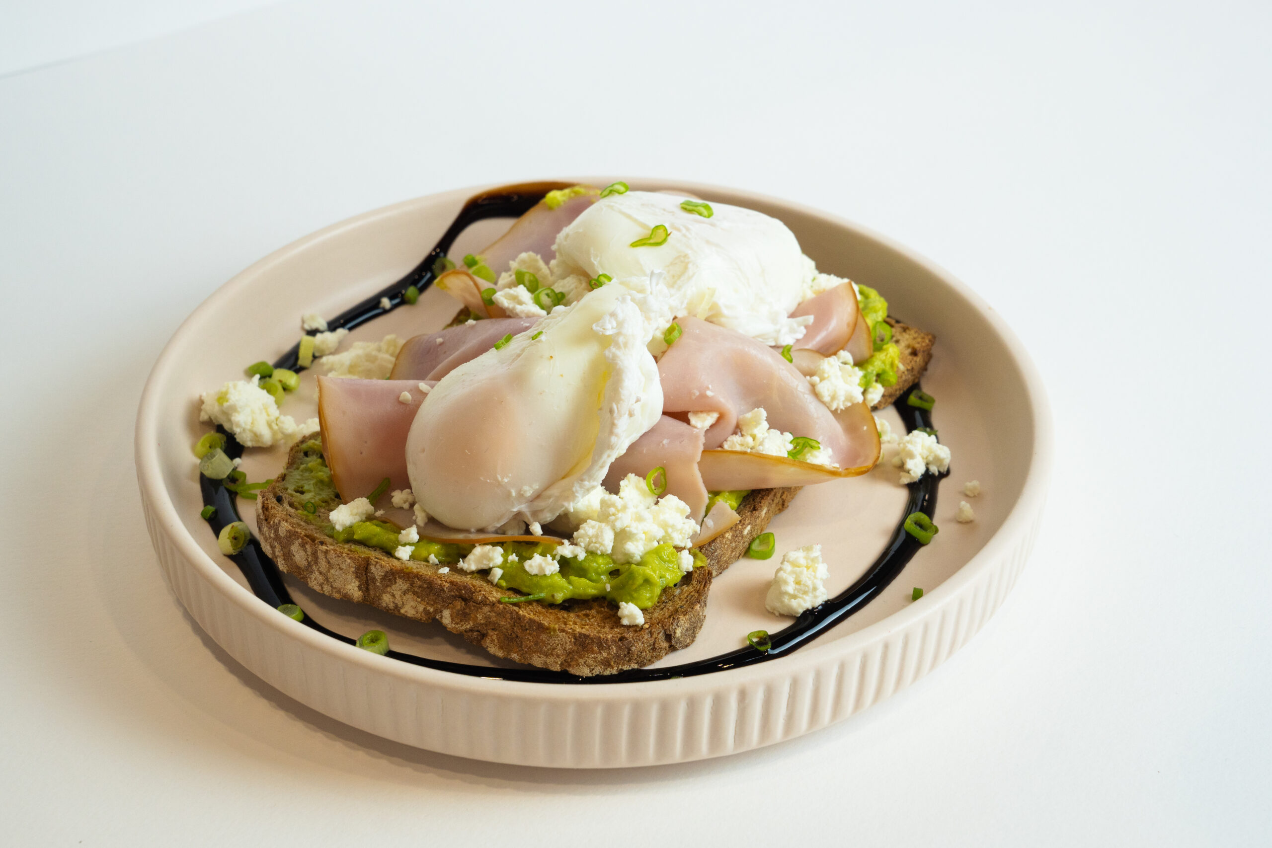 Black bull ψωμί με φαγοπυρο , κρέμα αβοκάντο , ποσέ αυγά , καπνιστό ζαμπόν φρέσκο κρεμμυδάκι , φέτα , κρέμα βαλσαμικο